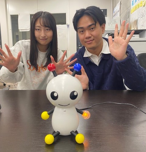 児童が企画・考案した脱炭素キャラクター(CO2検知ロボ)「だっちー※」を、本学ひらめきプログラム1期生・柳澤さん、柳田くんが具現化したもので、授業の中で“学びの題材”としても活躍しています。